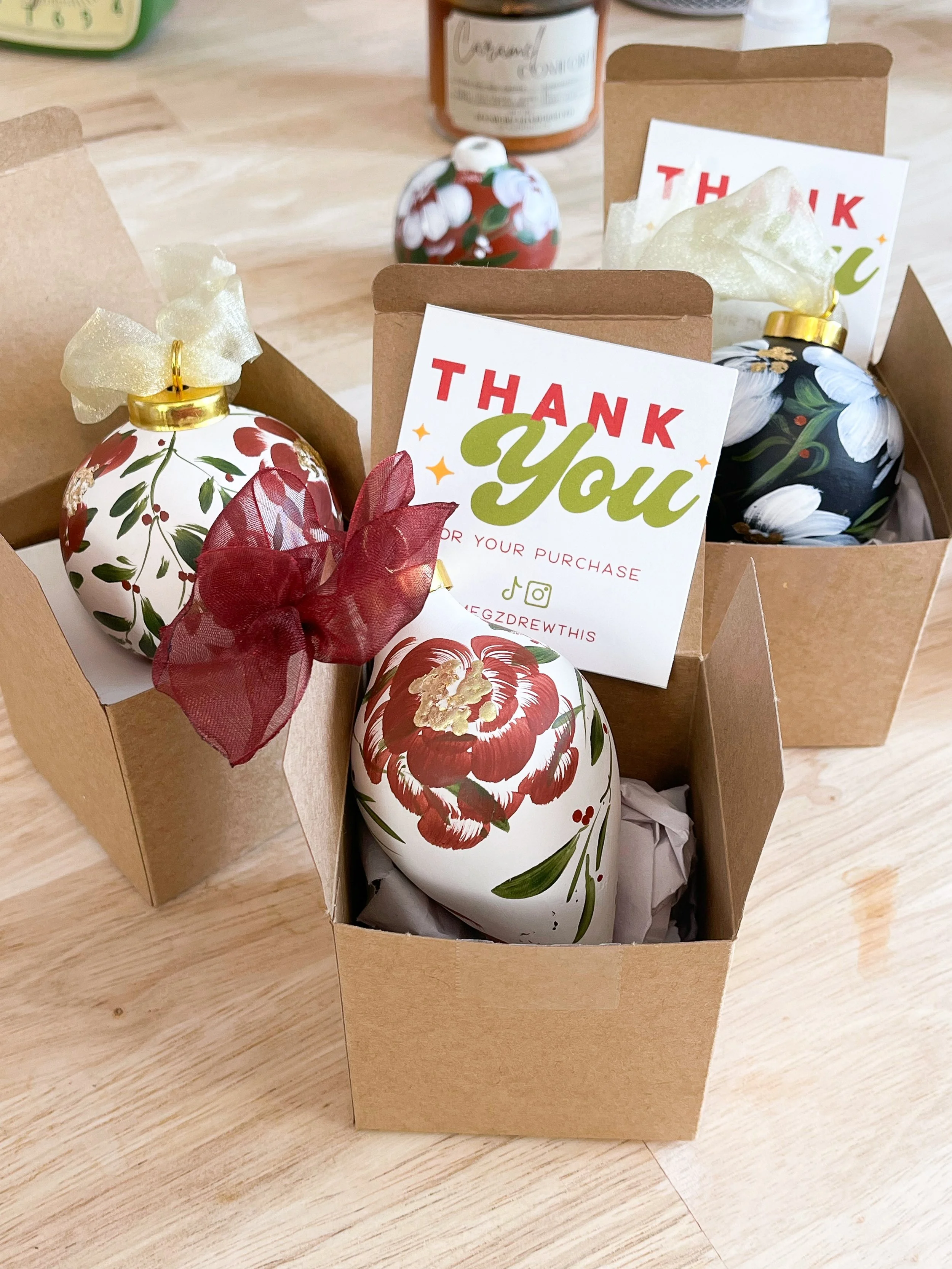 Every ornament is thoughtfully and meticulously packaged with great care. Each package is securely wrapped to guarantee safe delivery to its new destination. Additionally, a heartfelt thank-you note accompanies each ornament, adorned with a charming bow for a delightful finishing touch.